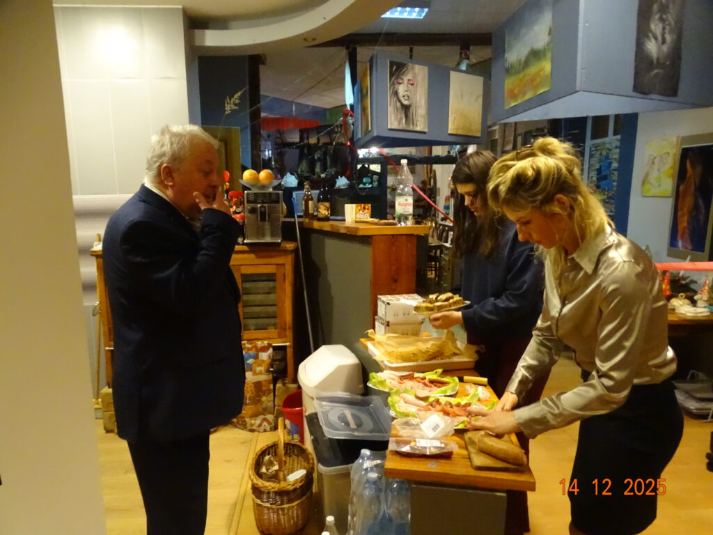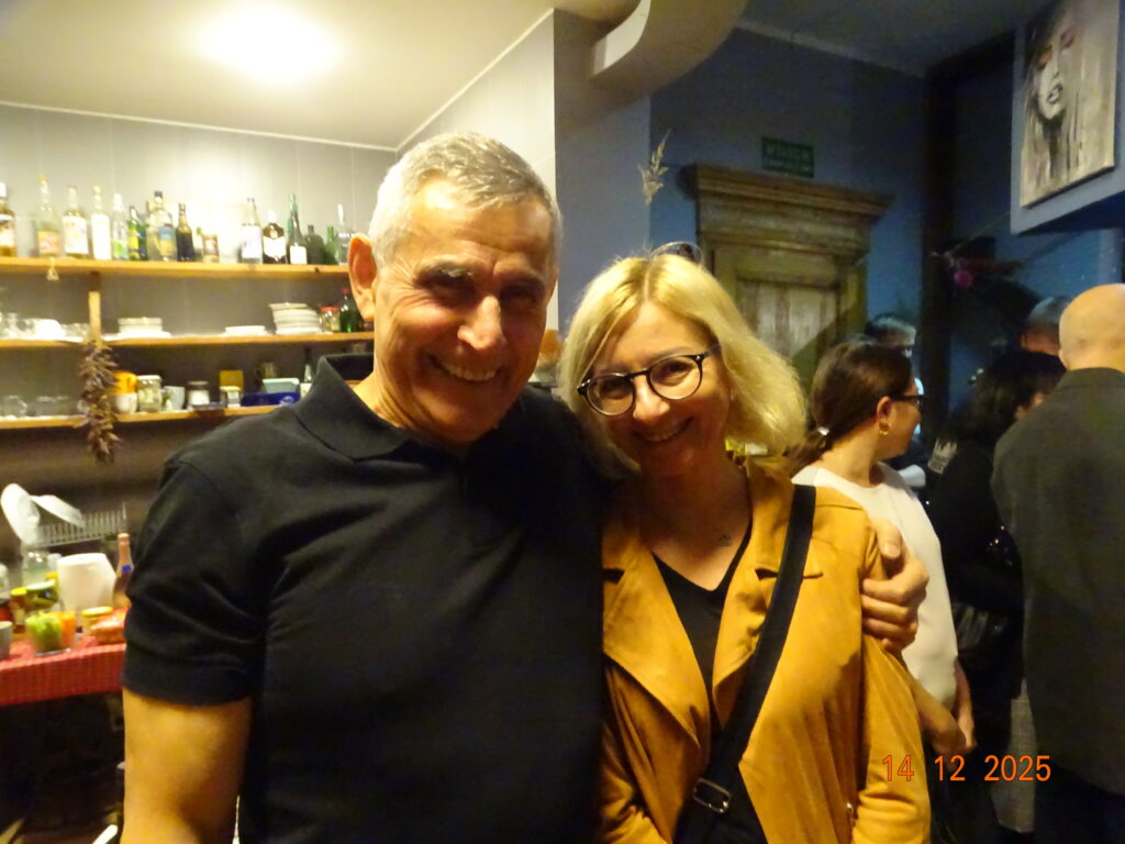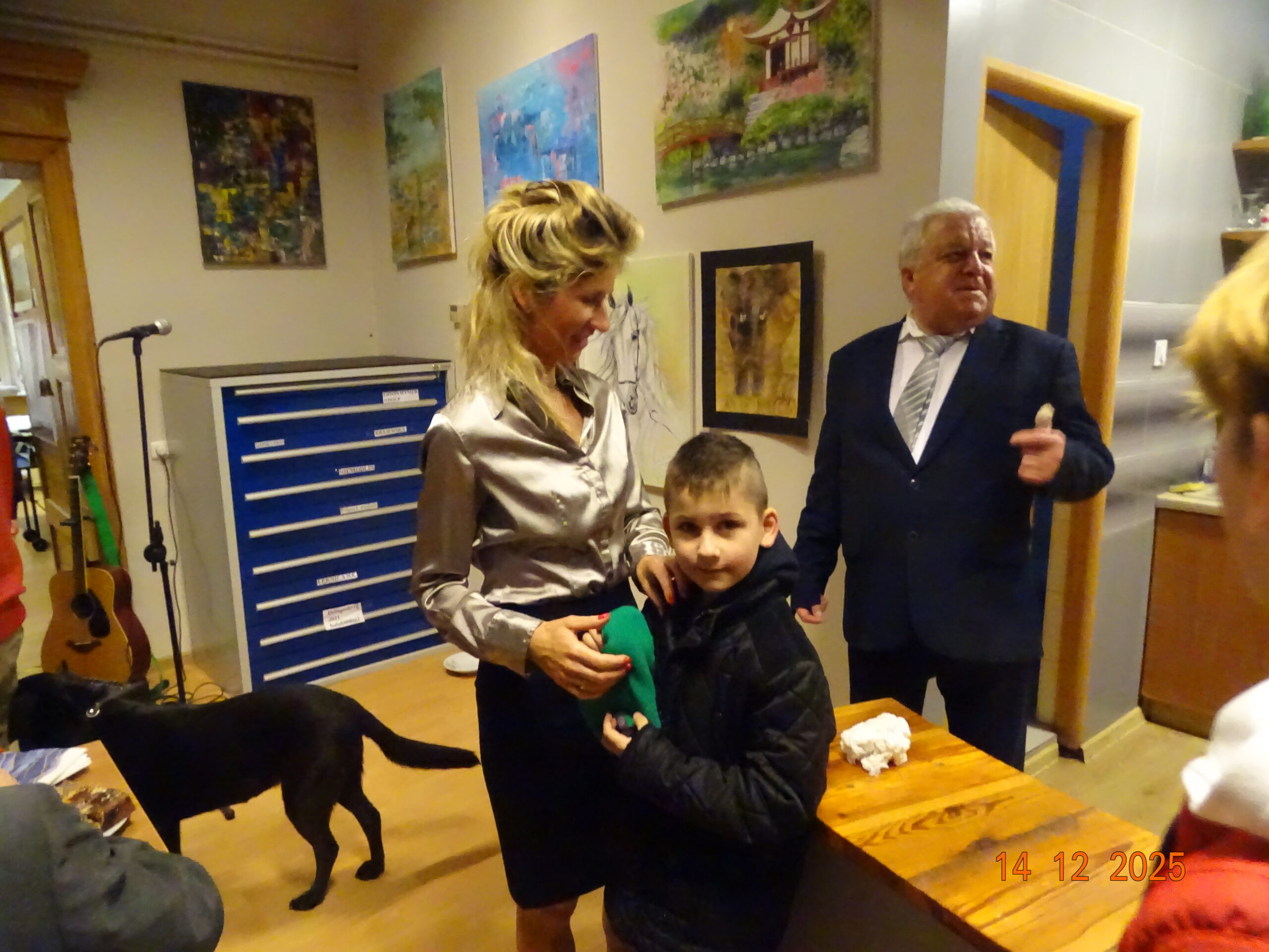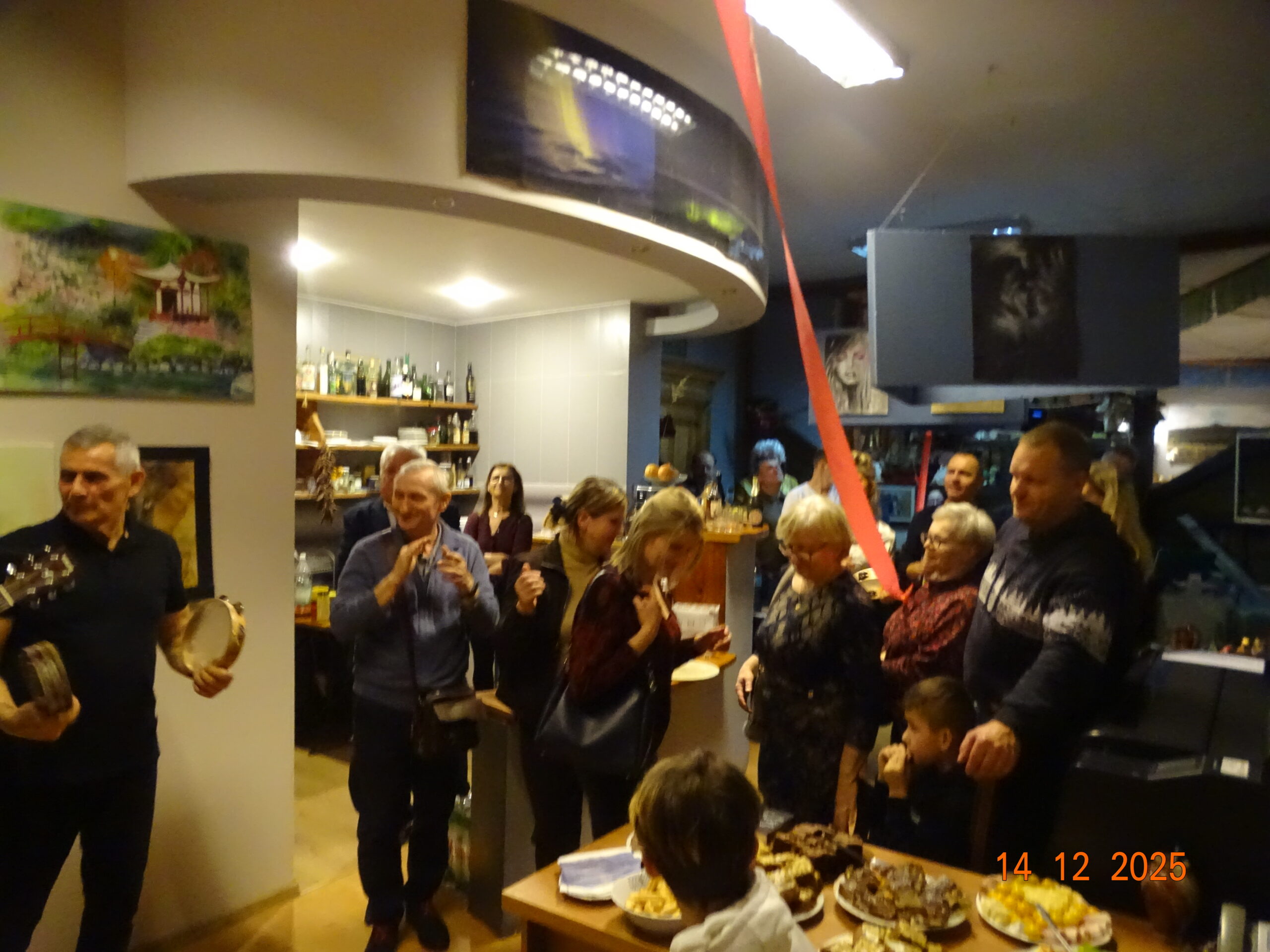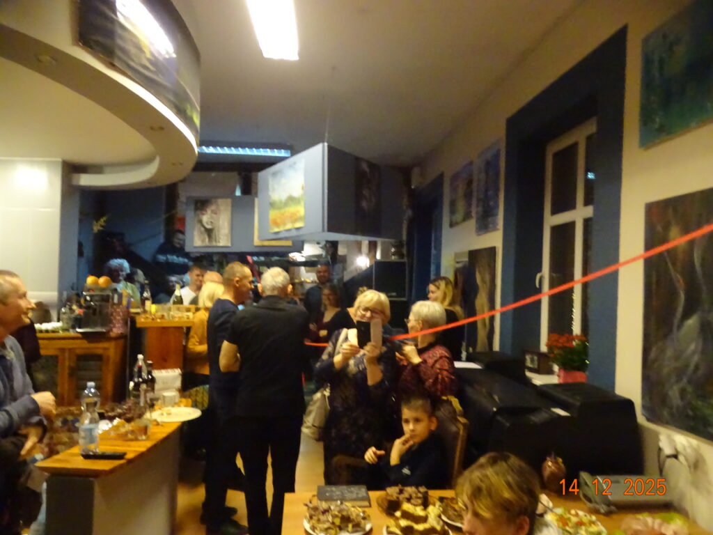 13 grudzień 2025 zgromadził w fundacji bardzo liczne grono osób (ponad 40) pragnących spotkać się ze sztuką, muzyką, niezwykłymi uczniami z Ośrodka Szkolno-Wychowawczego w Nowej Soli, jak i też odbyć podróż do Nowego Jorku i na Syberię drogą zesłańców. A wszystko to pośród wystawionych obrazów Moniki, które otaczały gości za sprawą Tereski i Kamilki tworząc niepowtarzalny klimat przygody życia. Do tego wszystkiego należy dodać ogromne biurko Pawła, które zamieniło się czasowo na wystawę prac dzieci z Ośrodka Szkolno-Wychowawczego pełne zaklętych myśli i emocji. Dominika Barańska przygotowaną na szybko wystawę prac swoich podopiecznych potwierdziła już nie pierwszy raz, że zasługuje na miano lidera kultury nowosolskiej. Minikoncert na oboju w wykonaniu jej córki Klary też spotkał się z bardzo ciepłym przyjęciem. Impreza trochę została zakłócona przez Szymona, który dosłownie spadł nam z nieba lądując dwie godziny wcześniej w Poznaniu z Hiszpanii i pojawił się zaraz w fundacji częstując nas hiszpańską muzyką w swoim wykonaniu. On wiedział gdzie tego wieczoru serwują smakołyki i śledziki. Jurek troszkę się obawiał czym poczęstować tak licznych gości, ale oni sprawili się na medal i biurka zamienione na stoły biesiadne uginały się od smakołyków. Każdy miał duży wybór, odstawiając na bok tylko te swoje. Szparagi od Elwiry jak zawsze wspaniale przygotowane szybciutko rozeszły się i to już w kuchni. No, ale nie samym jedzeniem człowiek żyje i wszyscy byli ciekawi jak poradzi sobie Monika, autorka obrazów z tak wymagającą publicznością. Jak nie Monika, to poradziły sobie same obrazy, które spotkały się z bardzo ciepłym przyjęciem szczególnie tej męskiej części widowni, bo były też ,,momenty,, na wiszących pracach. Szczególnym zainteresowaniem cieszył się obraz dziewczyna z kamienia, a to za sprawa Elwirki, która motyw kamiennej dziewczyny przywiozła w postaci fotki kolorowej groty z Arizony sama nie wiedząc o tym. Przypadkowo Paweł odwrócił fotkę i był to pierwowzór dla kamiennej dziewczyny. którą Monika zamieniła w żywą istotę. Na koniec powstał tryptyk, bo bystre oczko Jerzego z Zielonej Góry wychwyciło do kompletu Elwirkę na tle wiszących prac. Było gwarno, wesoło i świątecznie, bo i kilka kolęd też zaśpiewano. Sławek pokazał nam Nowy Jork, który w jego wydaniu stał się nam miastem przyjaznym dla ludzi. To nie była już tylko wielka aglomeracja to były kluby pełne dawnej muzyki, parki , stare metro i życzliwi ludzie. Jerzy z Zielonej Góry zaskoczył kompletnie wszystkich przedstawiając historię utworu Adama Mickiewicza o Beniowskim i deklamując jego część. Brawo Jerzy! Wieczór bardzo szybko upłynął, a najbardziej celnie ujął to Arek mówiąc, że takie spotkania trzeba robić, bo ludzie już odwykli od prostych rozmów ze sobą. Dziękujemy wszystkim.