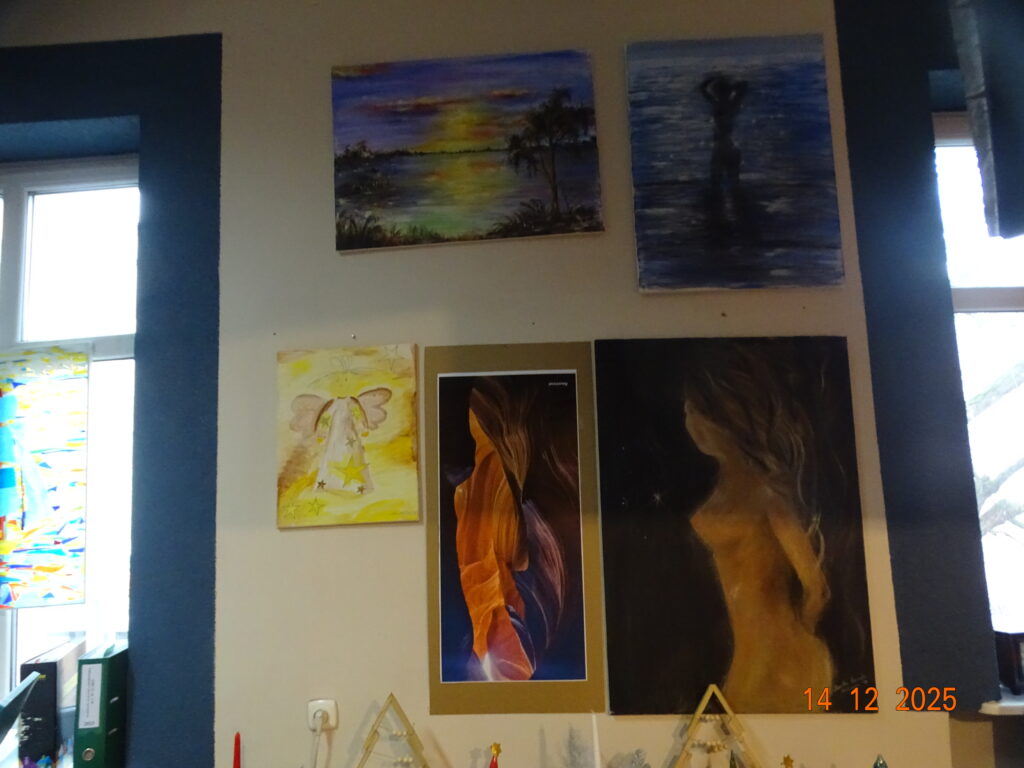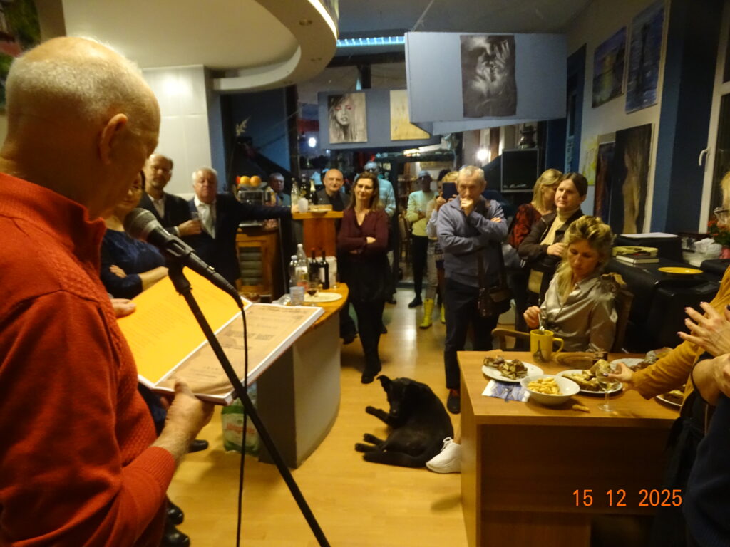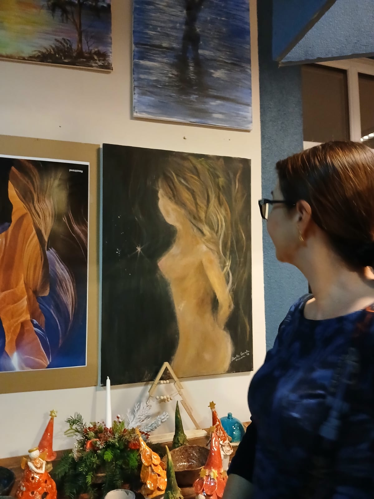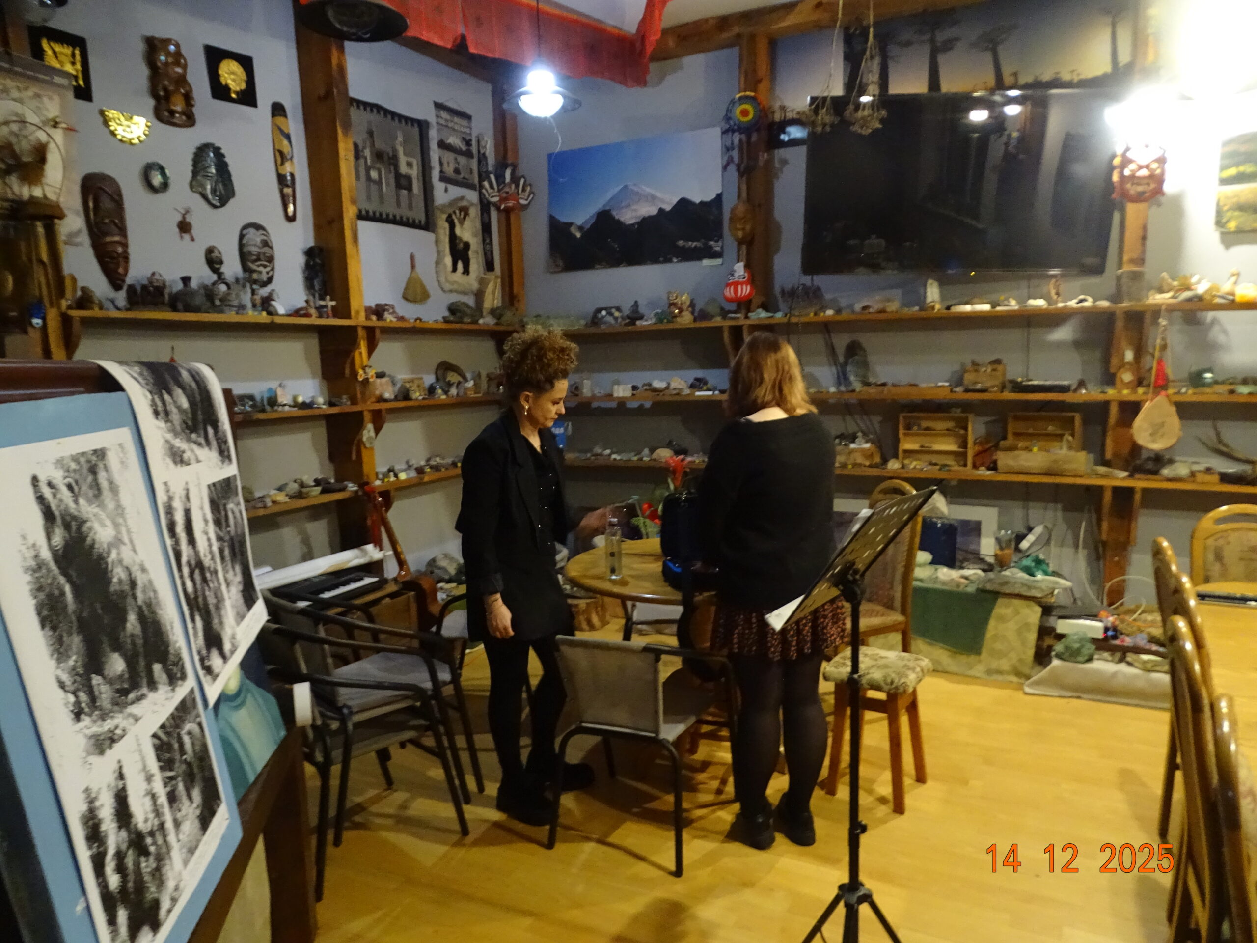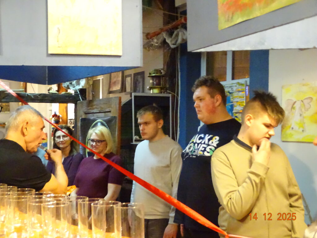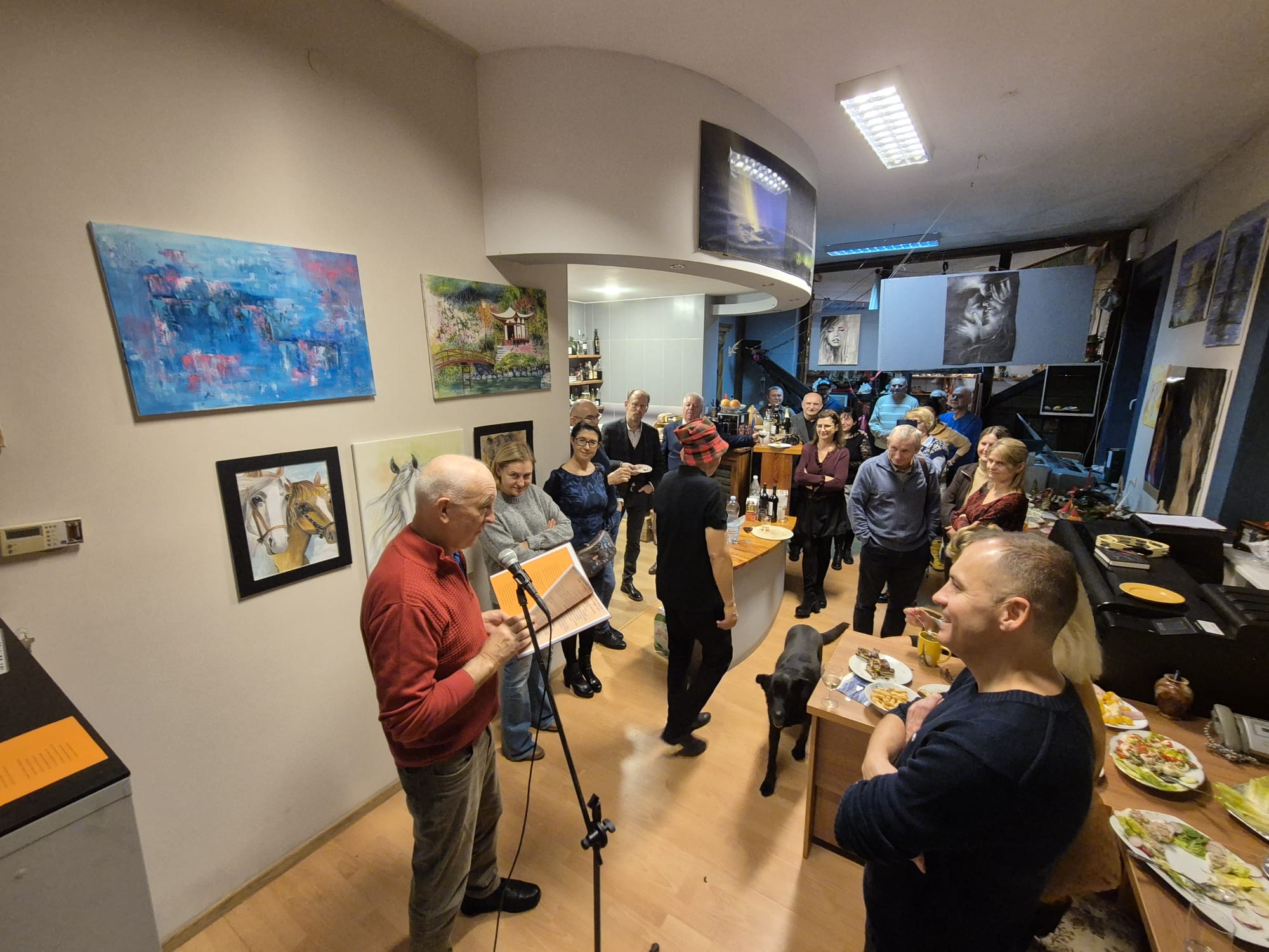 13 grudzień 2025 zgromadził w fundacji bardzo liczne grono osób (ponad 40) pragnących spotkać się ze sztuką, muzyką, niezwykłymi uczniami z Ośrodka Szkolno-Wychowawczego w Nowej Soli, jak i też odbyć podróż do Nowego Jorku i na Syberię drogą zesłańców. A wszystko to pośród wystawionych obrazów Moniki, które otaczały gości za sprawą Tereski i Kamilki tworząc niepowtarzalny klimat przygody życia. Do tego wszystkiego należy dodać ogromne biurko Pawła, które zamieniło się czasowo na wystawę prac dzieci z Ośrodka Szkolno-Wychowawczego pełne zaklętych myśli i emocji. Dominika Barańska przygotowaną na szybko wystawę prac swoich podopiecznych potwierdziła już nie pierwszy raz, że zasługuje na miano lidera kultury nowosolskiej. Minikoncert na oboju w wykonaniu jej córki Klary też spotkał się z bardzo ciepłym przyjęciem. Impreza trochę została zakłócona przez Szymona, który dosłownie spadł nam z nieba lądując dwie godziny wcześniej w Poznaniu z Hiszpanii i pojawił się zaraz w fundacji częstując nas hiszpańską muzyką w swoim wykonaniu. On wiedział gdzie tego wieczoru serwują smakołyki i śledziki. Jurek troszkę się obawiał czym poczęstować tak licznych gości, ale oni sprawili się na medal i biurka zamienione na stoły biesiadne uginały się od smakołyków. Każdy miał duży wybór, odstawiając na bok tylko te swoje. Szparagi od Elwiry jak zawsze wspaniale przygotowane szybciutko rozeszły się i to już w kuchni. No, ale nie samym jedzeniem człowiek żyje i wszyscy byli ciekawi jak poradzi sobie Monika, autorka obrazów z tak wymagającą publicznością. Jak nie Monika, to poradziły sobie same obrazy, które spotkały się z bardzo ciepłym przyjęciem szczególnie tej męskiej części widowni, bo były też ,,momenty,, na wiszących pracach. Szczególnym zainteresowaniem cieszył się obraz dziewczyna z kamienia, a to za sprawa Elwirki, która motyw kamiennej dziewczyny przywiozła w postaci fotki kolorowej groty z Arizony sama nie wiedząc o tym. Przypadkowo Paweł odwrócił fotkę i był to pierwowzór dla kamiennej dziewczyny. którą Monika zamieniła w żywą istotę. Na koniec powstał tryptyk, bo bystre oczko Jerzego z Zielonej Góry wychwyciło do kompletu Elwirkę na tle wiszących prac. Było gwarno, wesoło i świątecznie, bo i kilka kolęd też zaśpiewano. Sławek pokazał nam Nowy Jork, który w jego wydaniu stał się nam miastem przyjaznym dla ludzi. To nie była już tylko wielka aglomeracja to były kluby pełne dawnej muzyki, parki , stare metro i życzliwi ludzie. Jerzy z Zielonej Góry zaskoczył kompletnie wszystkich przedstawiając historię utworu Adama Mickiewicza o Beniowskim i deklamując jego część. Brawo Jerzy! Wieczór bardzo szybko upłynął, a najbardziej celnie ujął to Arek mówiąc, że takie spotkania trzeba robić, bo ludzie już odwykli od prostych rozmów ze sobą. Dziękujemy wszystkim.